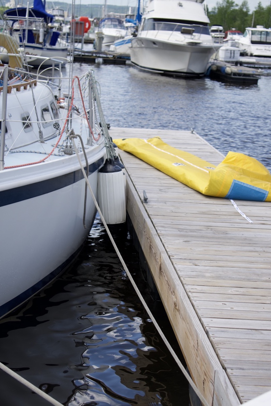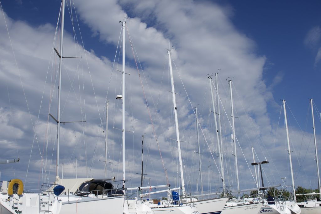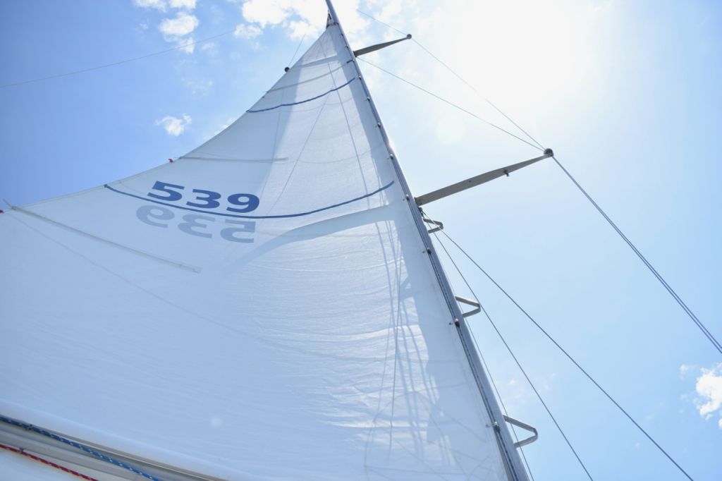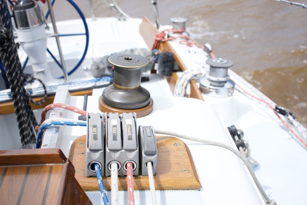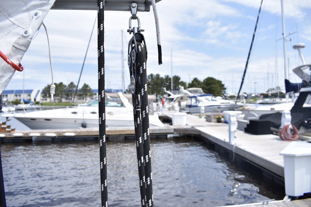 Moored at dock; mast wires rattling; taking out sail and attaching to jib; pulling lines; raising the halyard; Mainsail-only sailing; All sails sailing; stepping sounds; tacking; coming about; wing-on-wing; lowering Genoa sail; clutching and de-clutching rope lines, wrapping around the winches, cranking the winch and much much more!